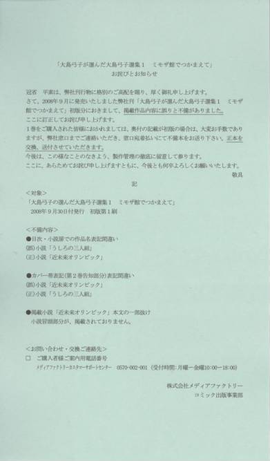 中に挟みこまれていた「大島弓子が選んだ大島弓子選集1 ミモザ館でつかまえて」お詫びとお知らせという紙に印刷されていた内容によると、どうやら1巻の初版は全て不良品らしいのです。